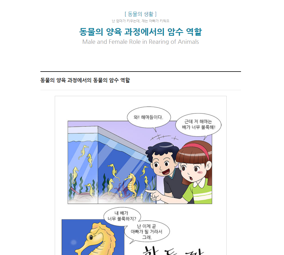 동물 중에는 해마, 가시고기, 꺽지, 물자라, 물장군 등과 같이 암컷이 알을 낳고 수컷이 알이나 새끼를 돌보는 부성애가 강한 동물 입니다.