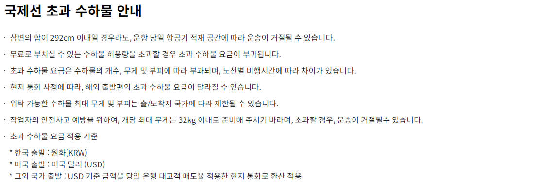 미주노선 외의 구간에서는 일반석 이코노미의 경우 23kg 한도 1개만 가능합니다.