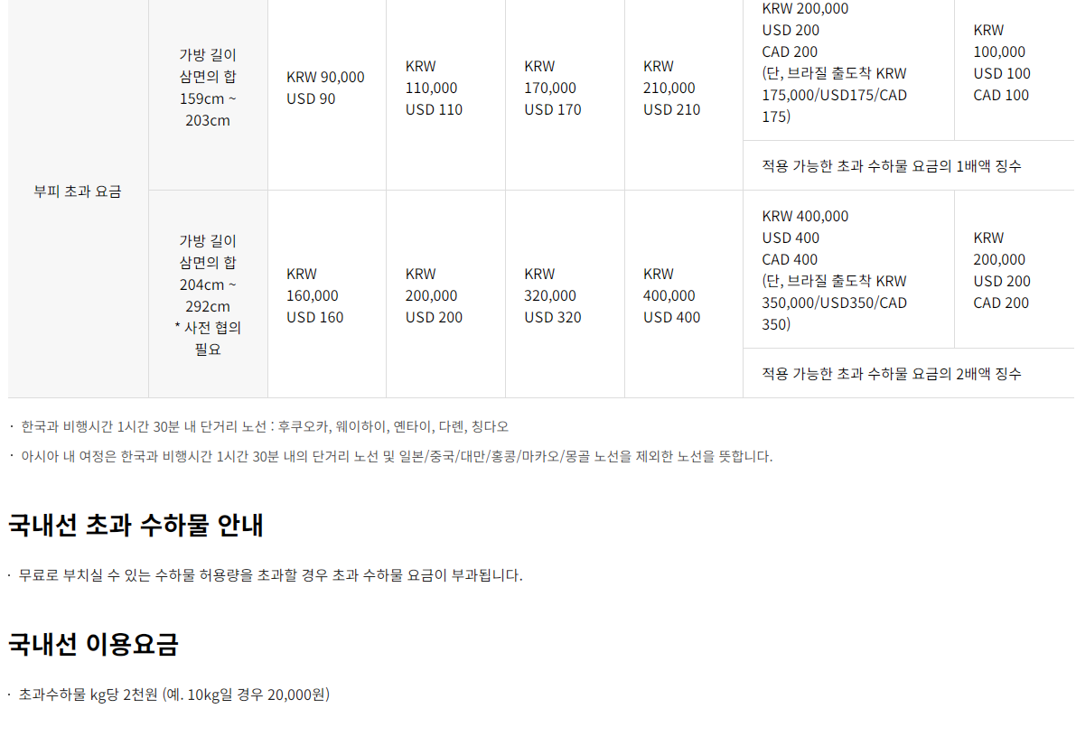 국내선을 이용하시는 경우 초과수하물 KG당 2천원이 부과됩니다.