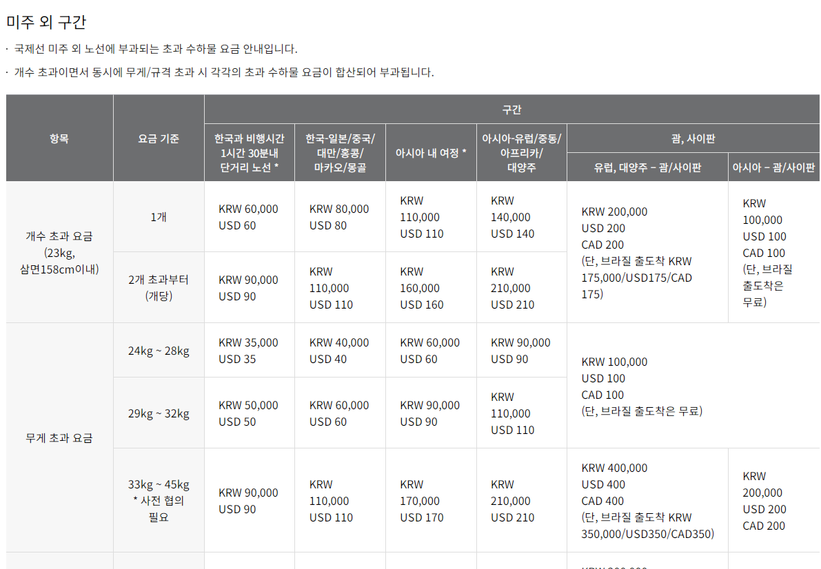 브라질 출도착의 경우 초과금이 175000원, 175달러 175캐나다달러로 적용됩니다.