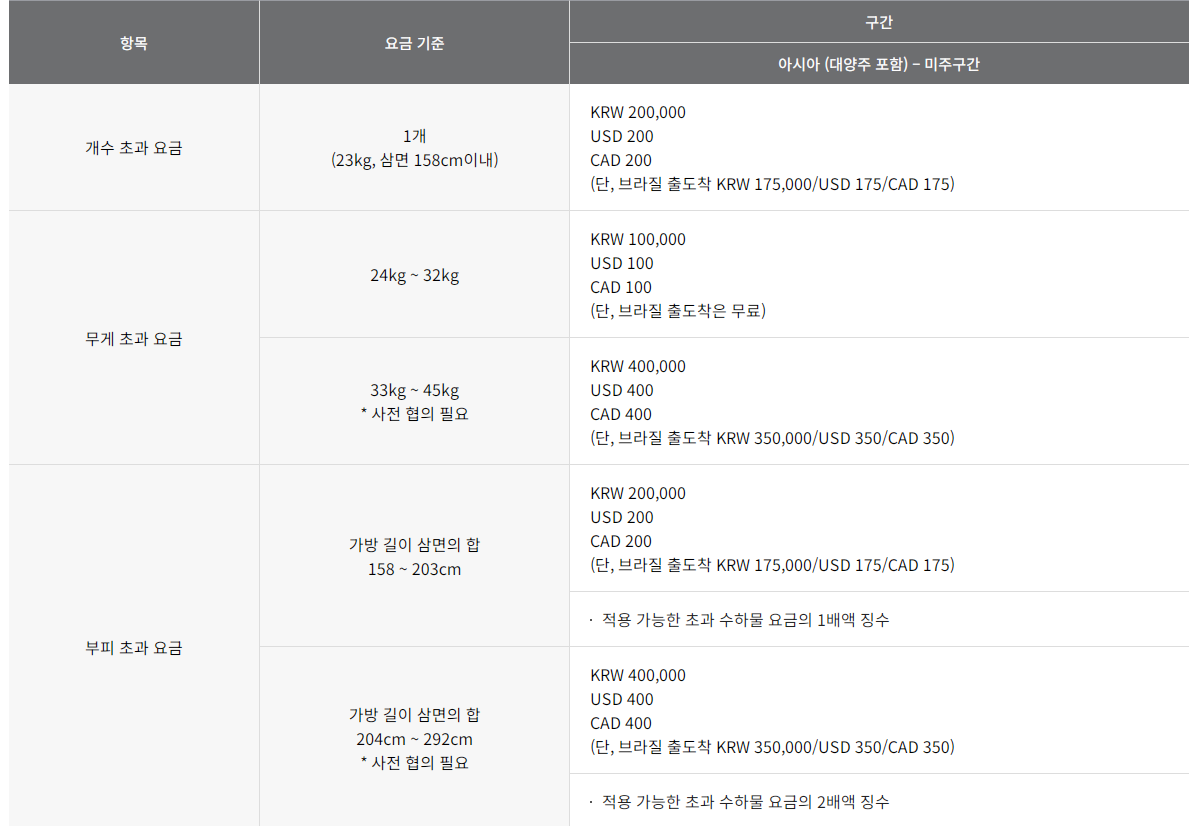 미주노선은 기본적으로 이코노미도 1인당 23kg 2개가 제공되어 넉넉하짐나 초과를 하게 되면 1개 추가 시 한화 20만원 미화 200달러 캐나다 달러 200달러 입니다. 한화로 내는게 가장 저렴합니다.