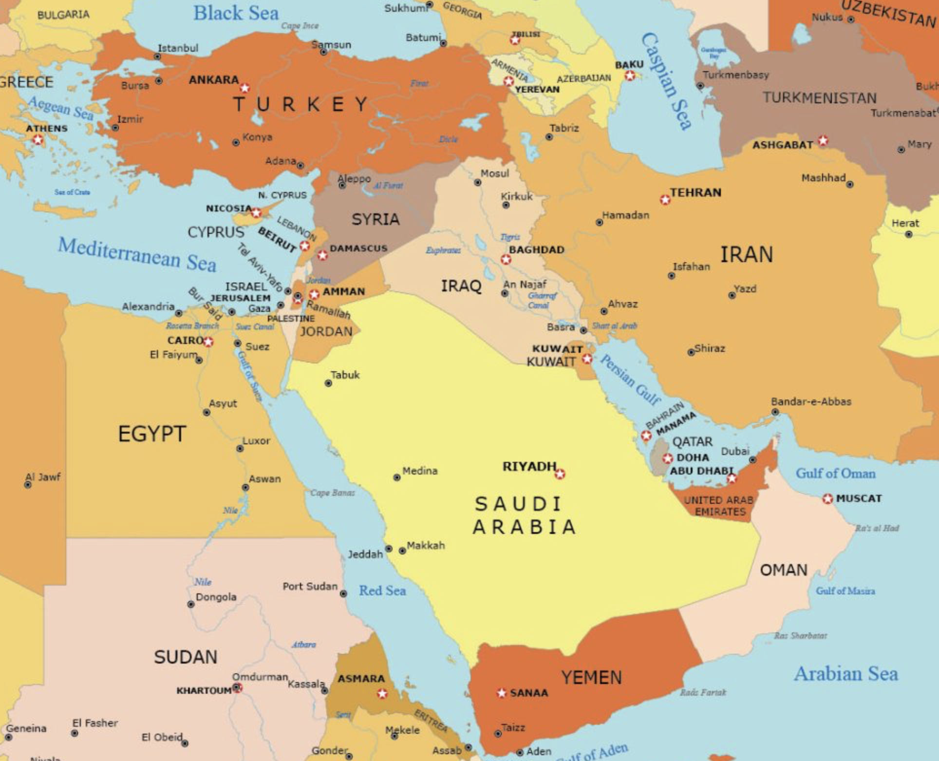 - 터키, 이란, 사우디아라비아, 이집트, 이라크, 이스라엘, 요르단 등 주요 17~18개국의 경계를 포함하고 있습니다.