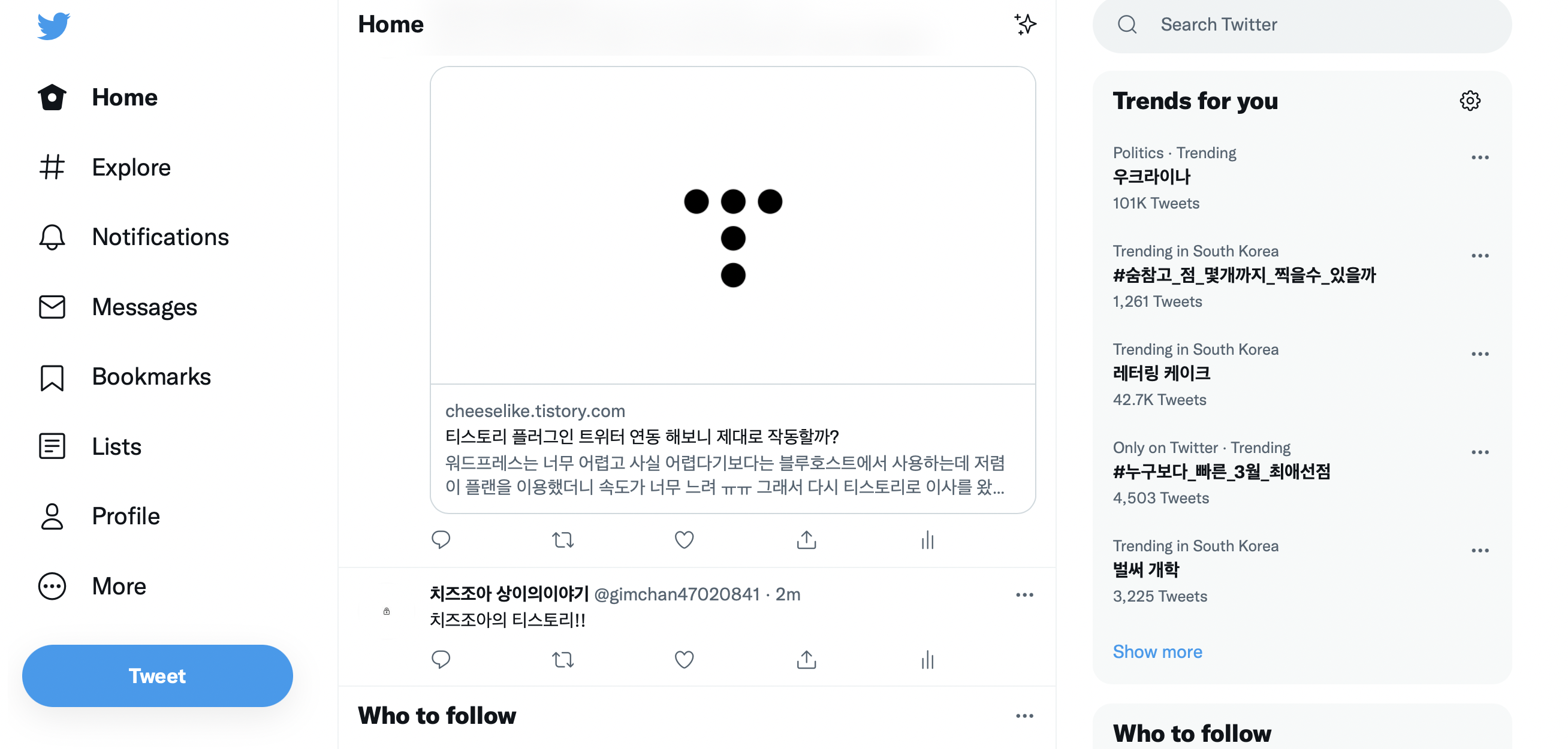 티스토리에 글을 쓰면 바로 트위터로 연동이 되는 플러그인이 잘 작동합니다.